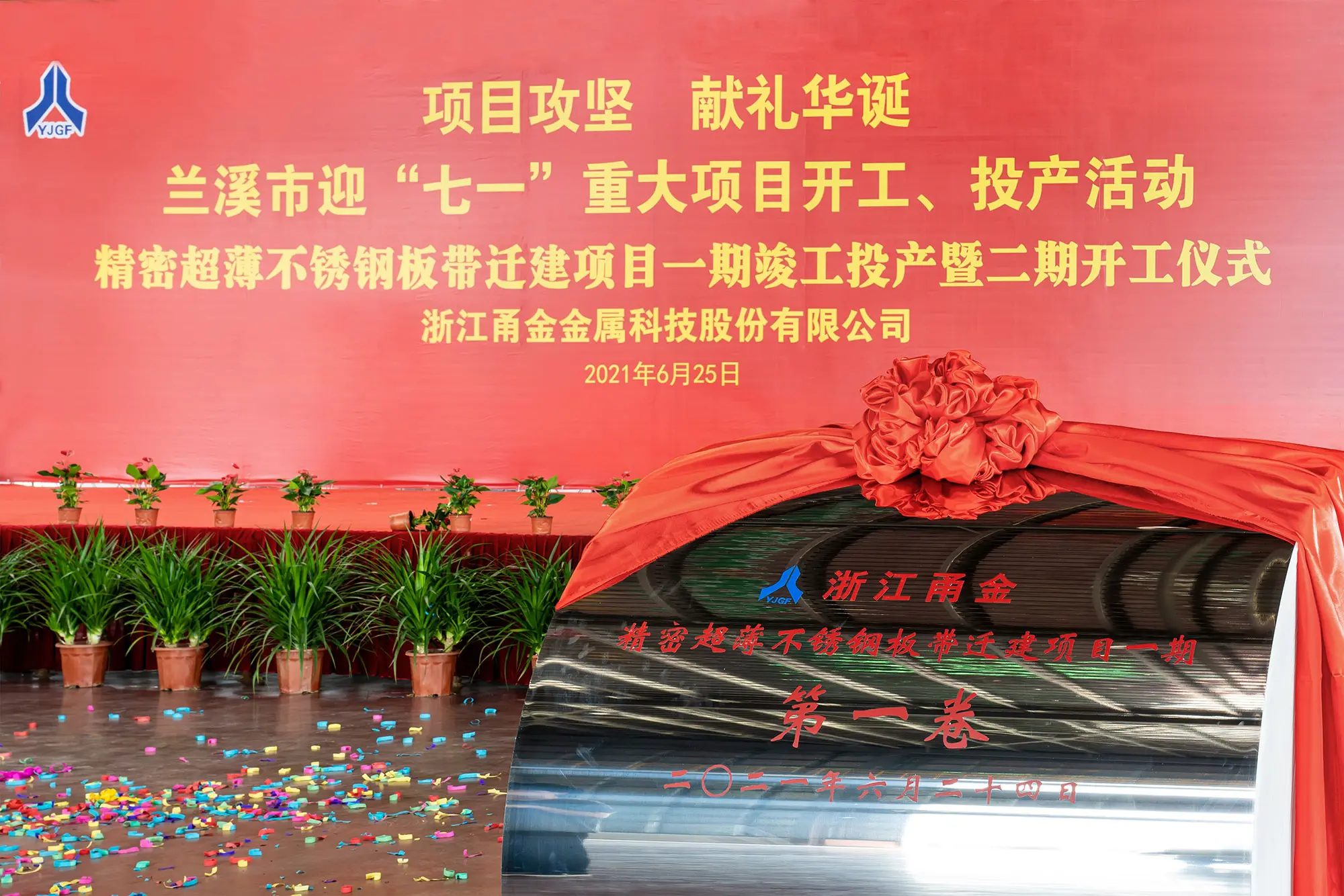 2021年6月25日,兰江之畔,横山脚下,甬金股份浙江迁建项目一期竣工投产暨二期开工仪式在浙江新厂区(灵洞乡耕头畈999号)隆重举行,现场出席仪式的主要嘉宾有兰溪市委书记陈峰齐、市长王新锋等政府主要领导,甬金股份董事长虞纪群、总经理周德勇,其他各单位主要负责人及代表。